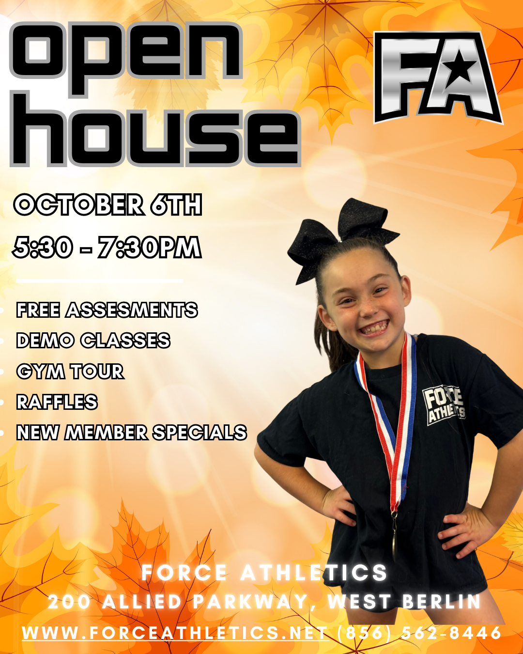 ~ Open to the public ~ Join Force Athletics Oct. 6, 5:30-7:30 p.m. for our Fall Open House! Class Demos, Tours of the Gym, Raffles, & Enrollment Specials you won’t want to miss! Register now to sign up for our FREE SWAG BAG!